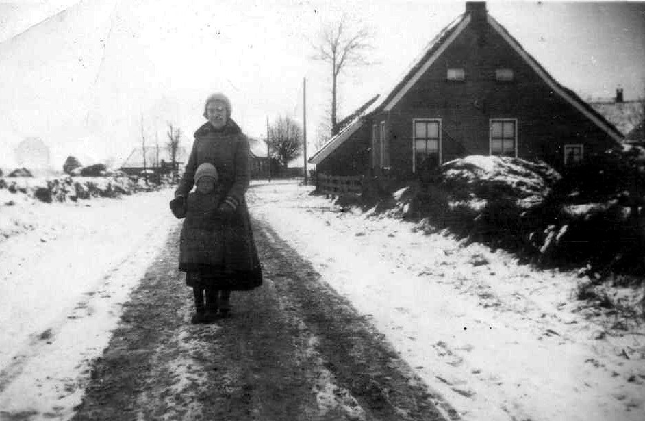 Dit winters tafereeltje is geschoten in de Hoek, waarschijnlijk dateert deze foto van vòòr 1950. Rechts is de boerderij van Wout en Ottie van Bochove (de Hoek 8) te zien, linksachter staat de boerderij met schuur de Hoek 29. In die boerderij woonden eind 19e, begin 20ste eeuw Roelof Bonder en Grietje Boer, de grootouders van Roelof Bonder van de Bosakkers. In die boerderij is ook zijn vader geboren. En die heette … ook Roelof. Momenteel wonen daar nu Georg Landlust en Alina Leyendekker.